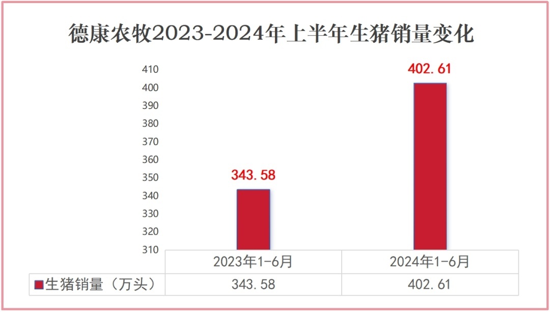养猪业务是德康农牧经营重点。中报披露,2024年上半年德康农牧出栏生猪402.61万头,同比增长17.18%。其中,商品肉猪销量为392.55万头,占生猪总销量近97%,其他猪销量为10.06万头。